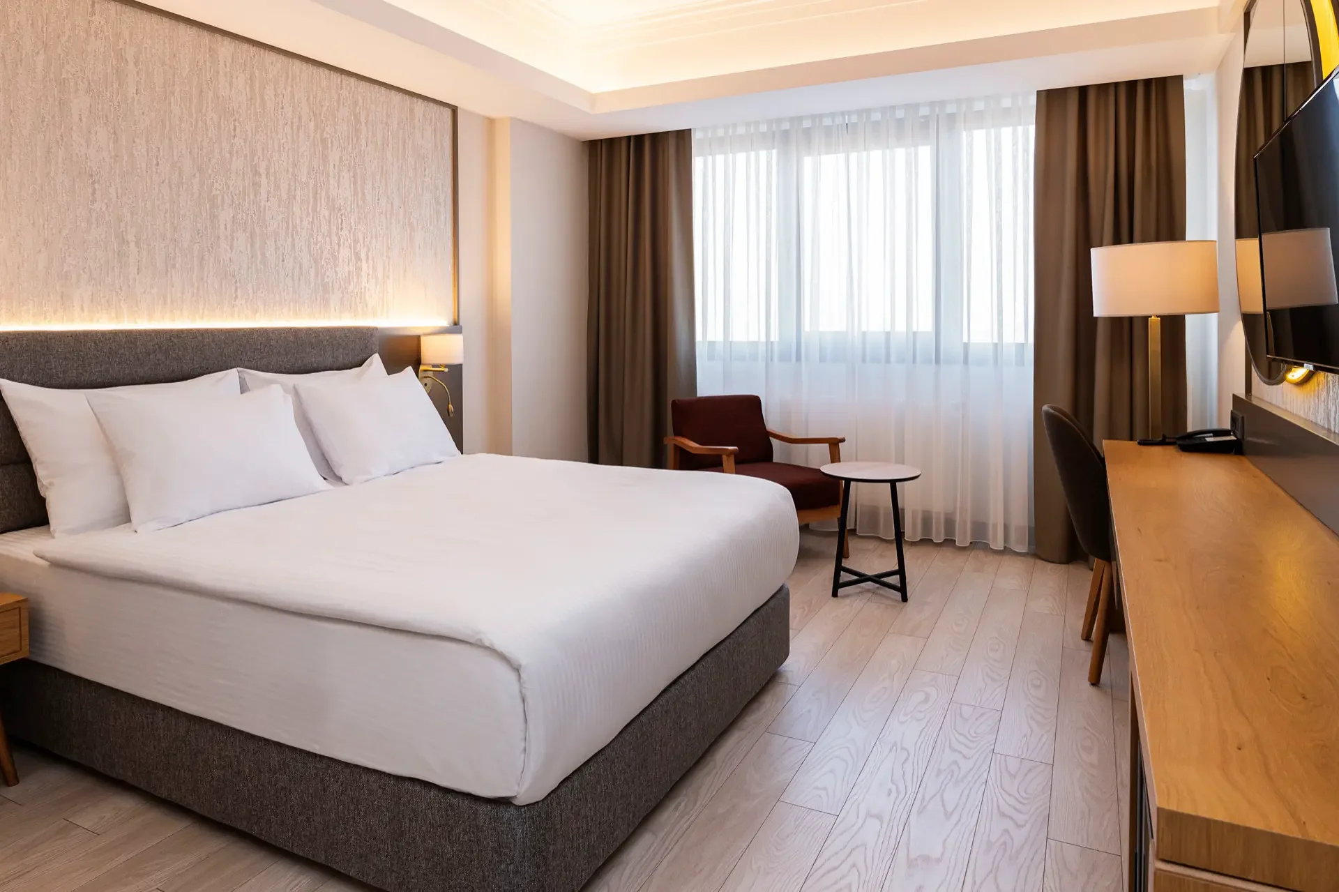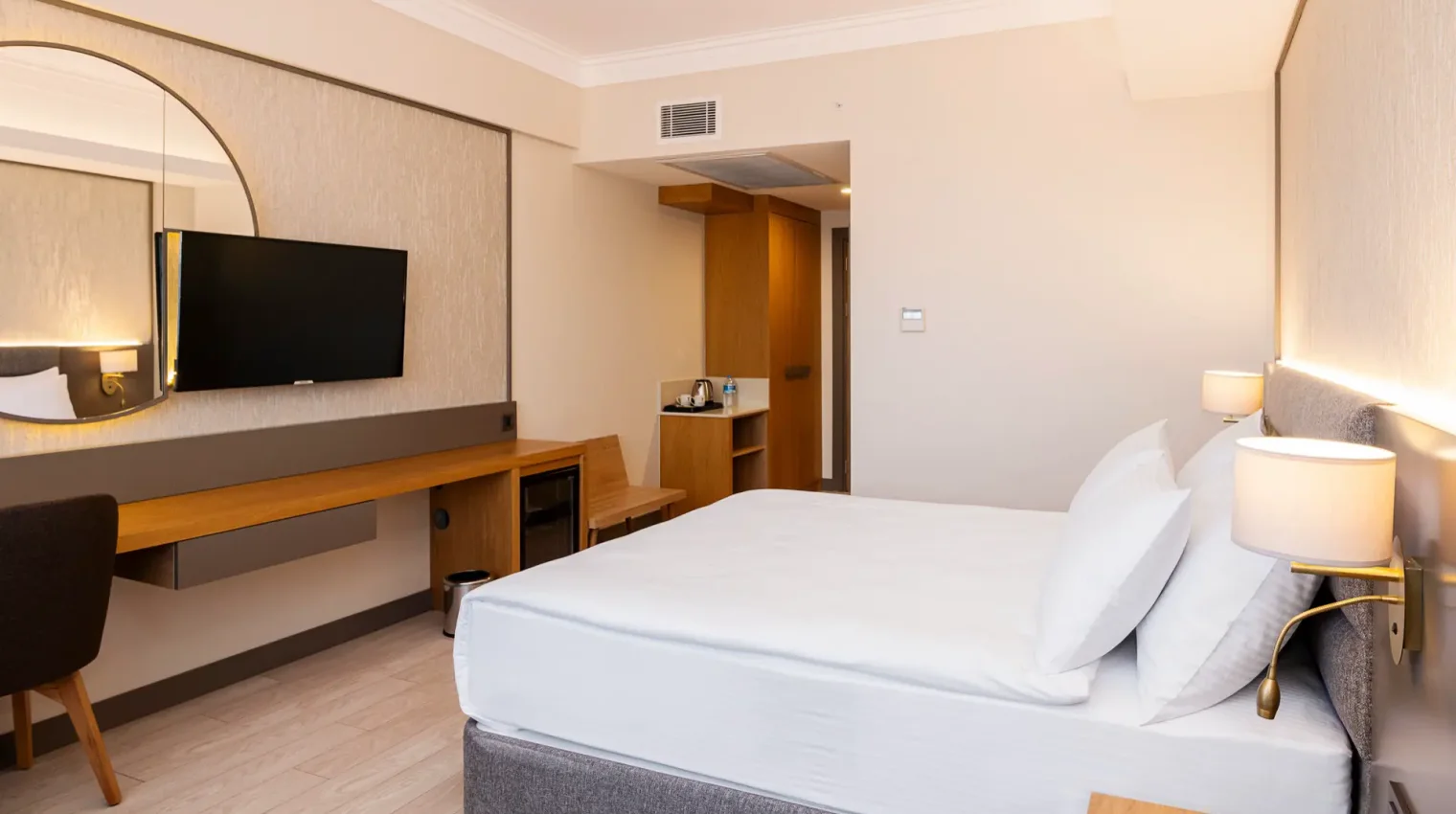 Havuz ve dağ manzarası eşliğinde dinlendirici bir konaklama sunuyoruz. İki kişilik yatak seçeneği ile mükemmel bir tercih olan standart odalarımız, modern dokunuşları ve rahatlatıcı atmosferiyle öne çıkmaktadır. Modern ve sade tasarımıyla öne çıkan bu odalarımızda konforunuz bizim önceliğimizdir.